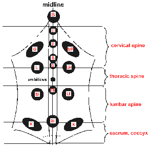 Therapy usually starts with the basic points. The therapist decides which Y points are to be used after palpitating the diagnostic zones on the neck and abdomen. The sensitivity to pressure of the diagnostic area recedes immediately after applying the needles to the corresponding acupuncture point if the needles are positioned correctly.